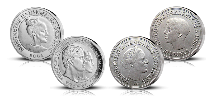 Sættet består af de eneste to mønter præget med vores nye konge. 10-kronen i sølv udgivet i forbindelse med den daværende Kronprins Frederiks 18-års fødselsdag og 200-kronen i sølv præget for at fejre brylluppet mellem Kronprins Frederik og Mary Donaldson i 2004. Vores nye Kong Frederik X og Dronning Mary.