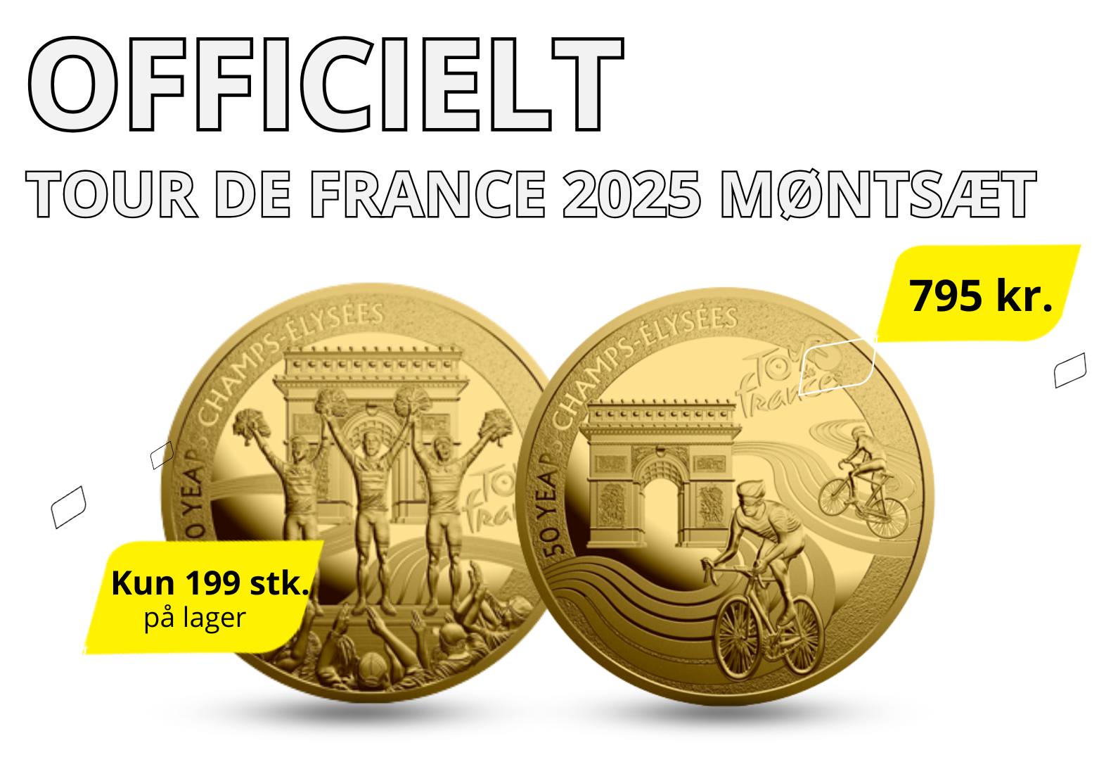 I anledning af det ikoniske 50-års jubilæum for Tour de France-finalen på Champs-Élysées udgives nu et eksklusivt og officielt godkendt møntsæt – skabt i tæt samarbejde med løbets arrangør, A.S.O. Dette særlige samlersæt består af to guldbelagte mønter i proof-kvalitet, der indfanger nogle af de mest ikoniske øjeblikke i Tourens historie.